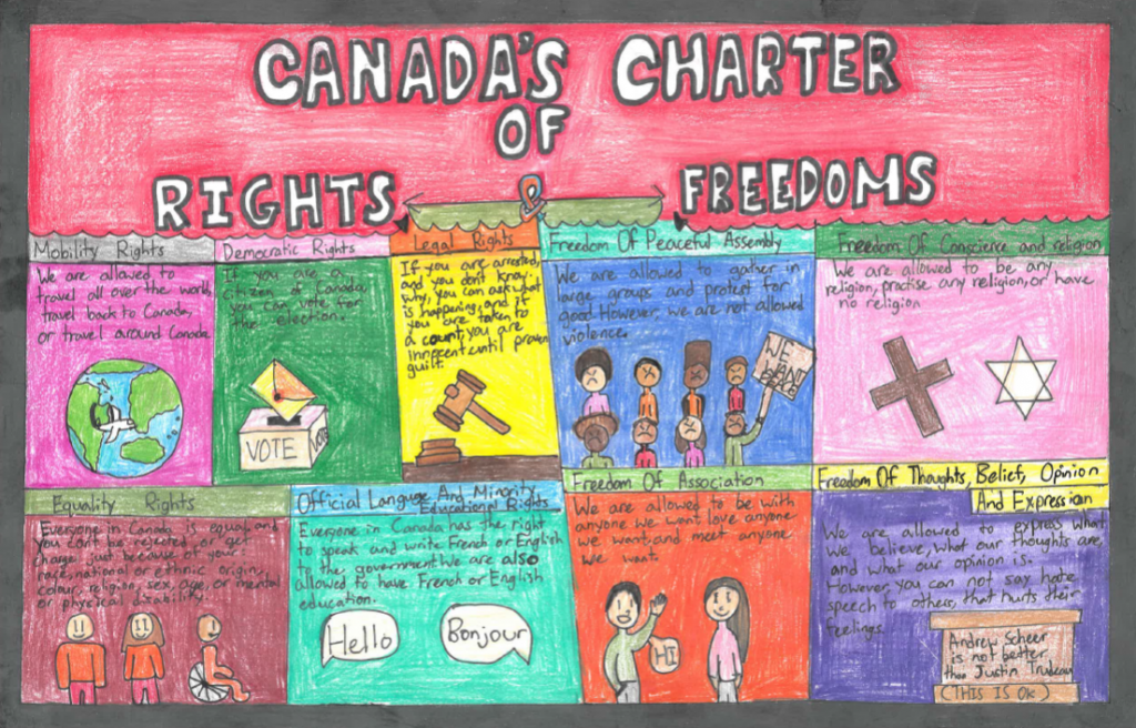The 2019-2020 winner of the OJEN Poster Challenge in the Toronto Region is Mincheng from North York. Mincheng was ambitious, attending to most of the fundamental rights and freedoms enshrined in the early sections of our Charter. Congratulations Mincheng on your hard work!