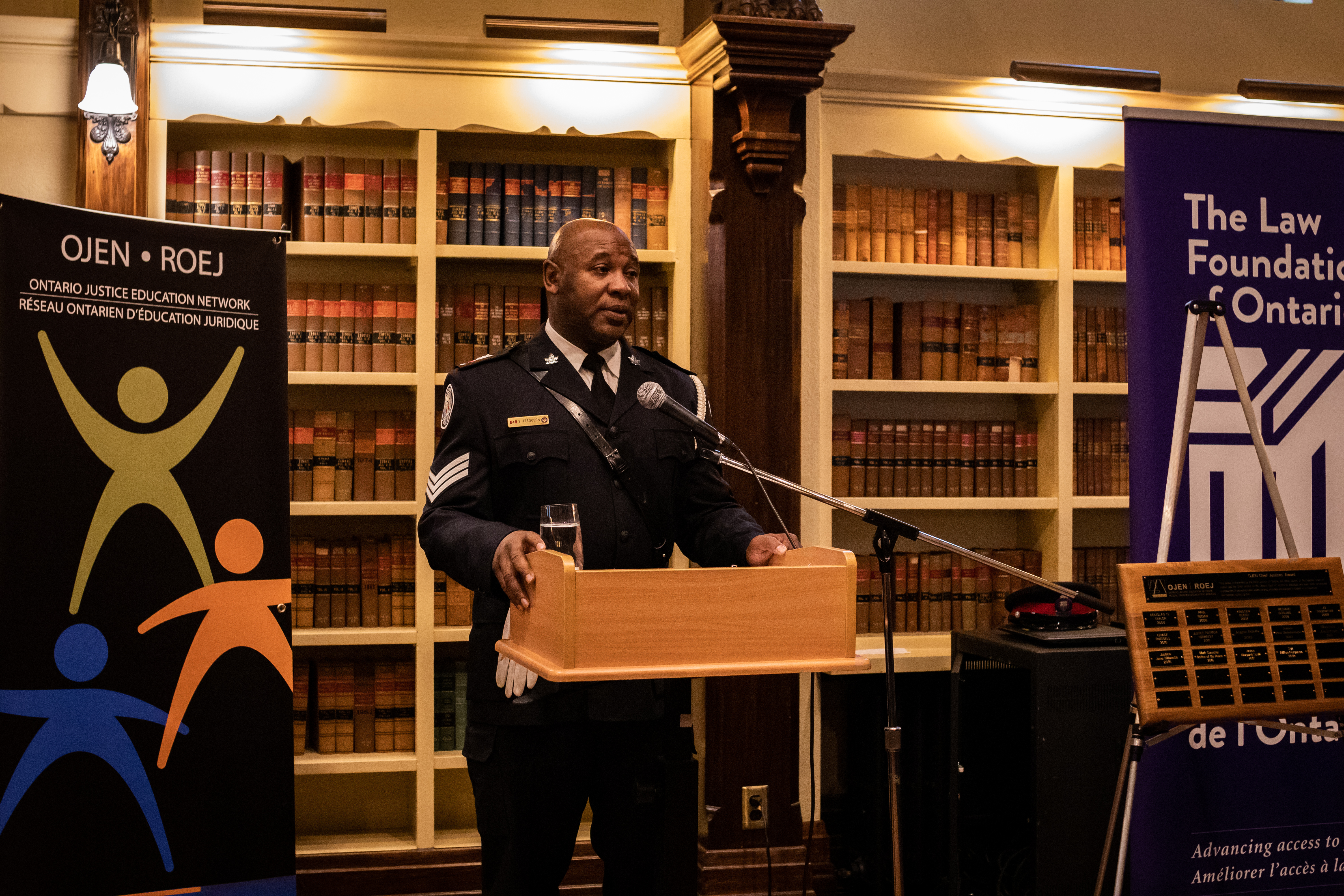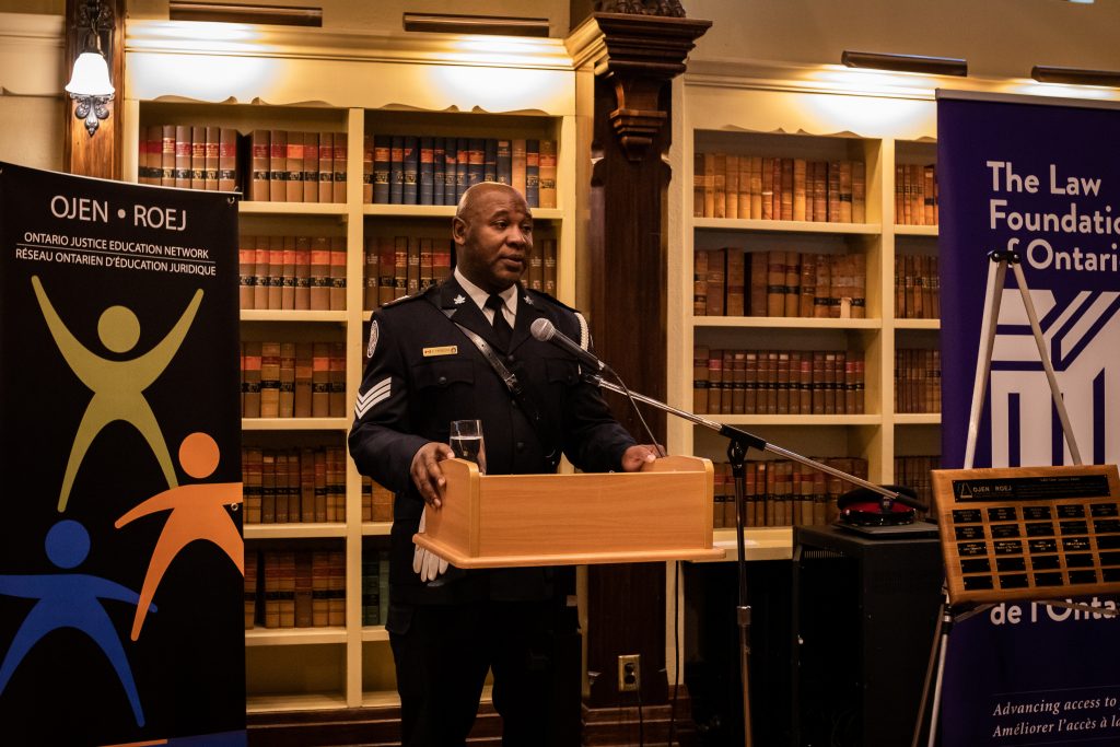Sergeant Ferguson was nominated for the award by Crown lawyer, Roger Shallow, who has volunteered on many OJEN justice education programs and by Damon “Soul-R” Maraj, Managing Director of IMPACT ‘n Communities, a community youth organization that has hosted OJEN programs Sergeant Ferguson has volunteered with.