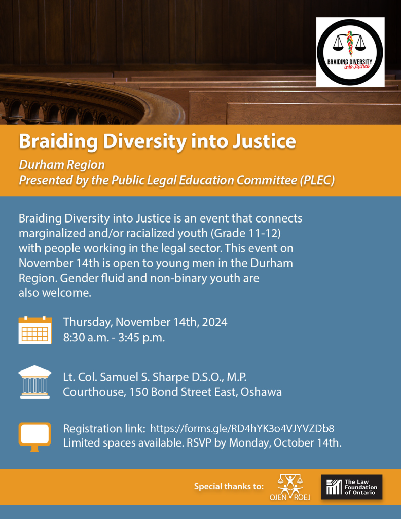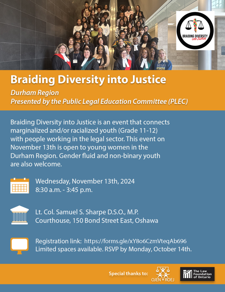 In the Durham region, OJEN’s Durham Committee presents this program, which showcases a variety of legal professionals, emphasizing the different careers in justice and the non-linear pathways to reach them.
