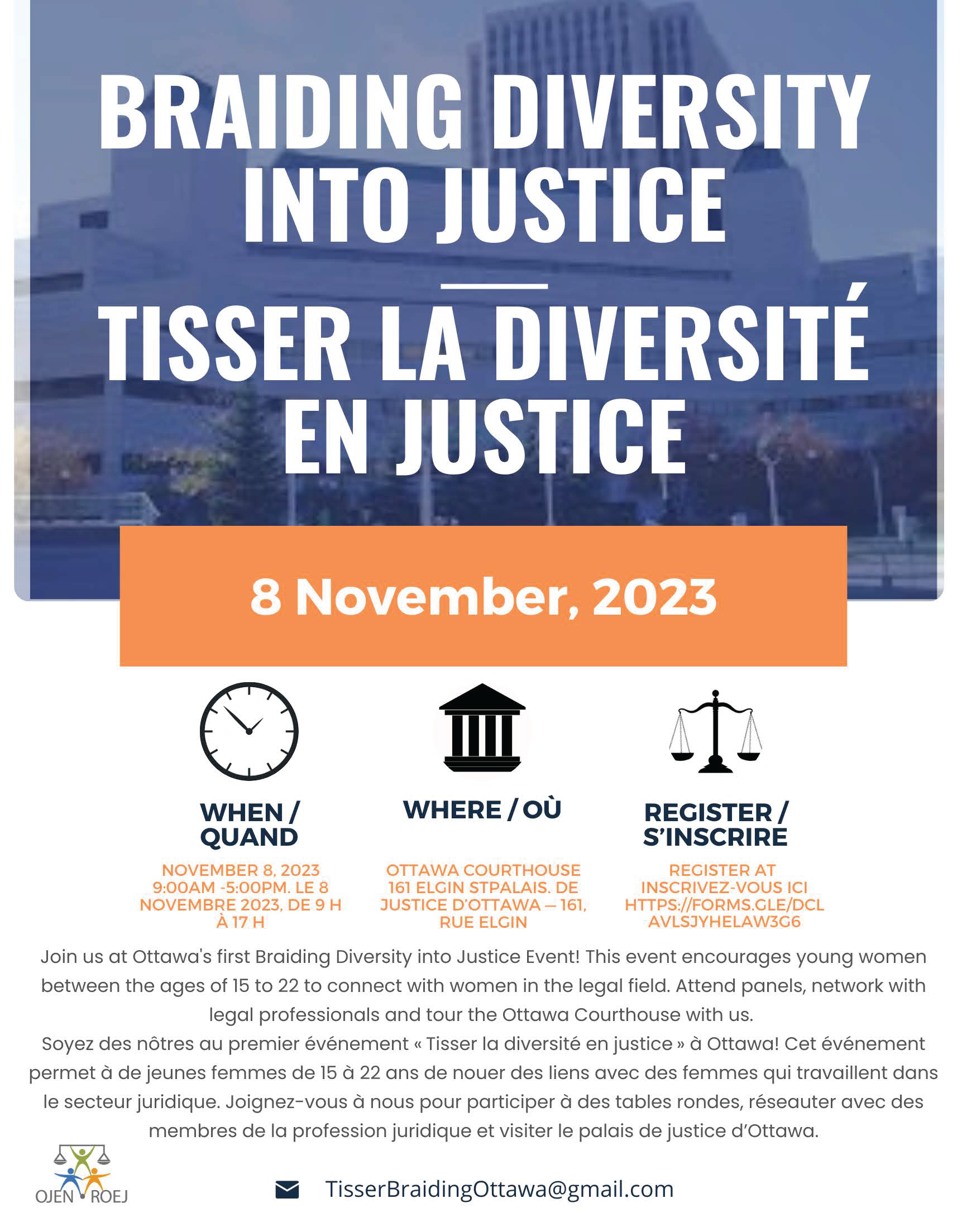 Join us at Ottawa’s first Braiding Diversity into Justice event! This event encourages young women between the ages of 15 to 22 to connect with women in the legal field. Attend panels, network with legal professionals, and tour the Ottawa courthouse with us.