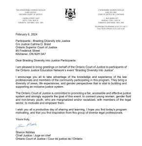 This program began as an initiative of the Waterloo OJEN Committee in 2018. It was designed as a single-day, in-person event, however it can be modified for remote delivery and the time can be adjusted as required. In the Waterloo context, registration has historically been open to youth who identify as women between the ages of 16 and 20 who are interested in pursuing a career in justice. The program can be adapted for any audience depending on the needs and interests of youth in your community.
