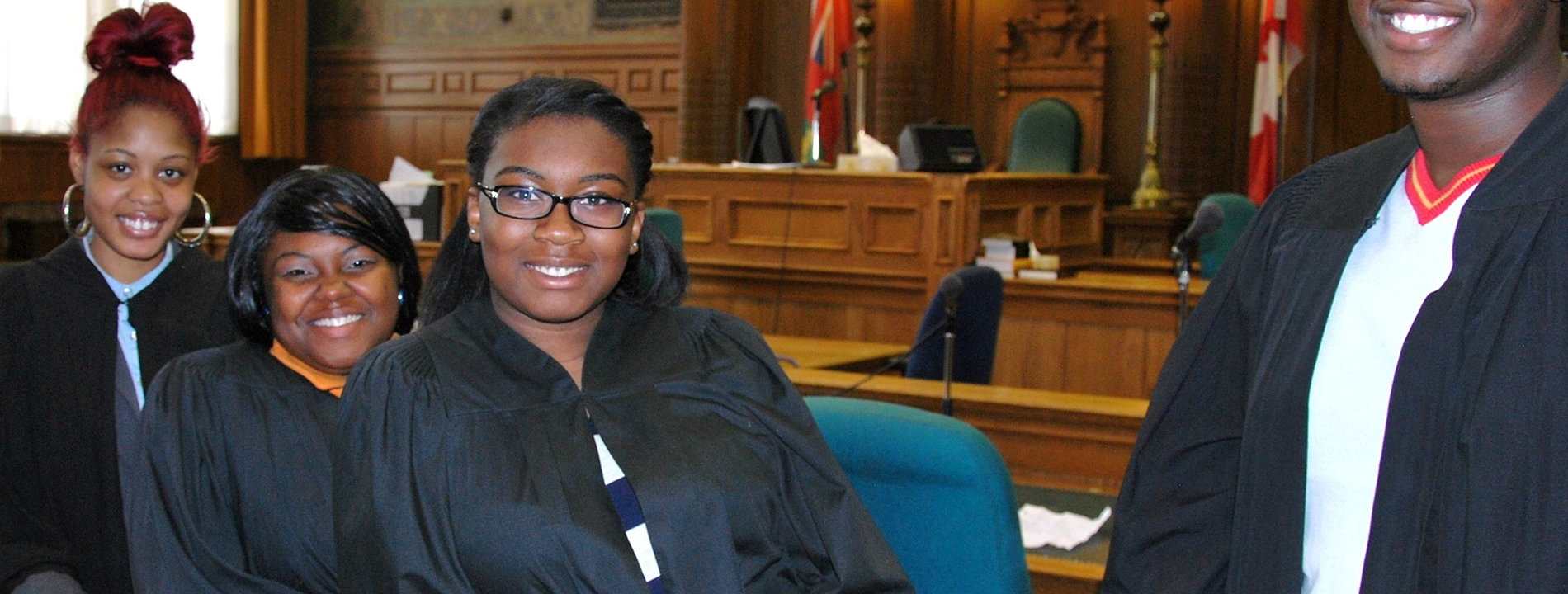 Mock hearings use a collaborative, interactive, dialogue-based approach to bring the law to life for youth participants. Youth take on roles of lawyers, witnesses, accused and court staff to enact a simulated legal hearing. Volunteer lawyer and/or law student coaches help prepare them for their roles and share tips on how to build their case. Participants learn about courtroom procedure and the roles of various legal professionals while they develop critical thinking and advocacy skills.